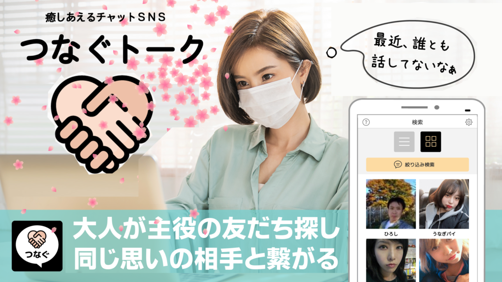 つなぐトークは、オンラインで利用する何万もの利用者がそれぞれ自分の希望する仲間や友だちを探して、交流することができるチャットアプリです。